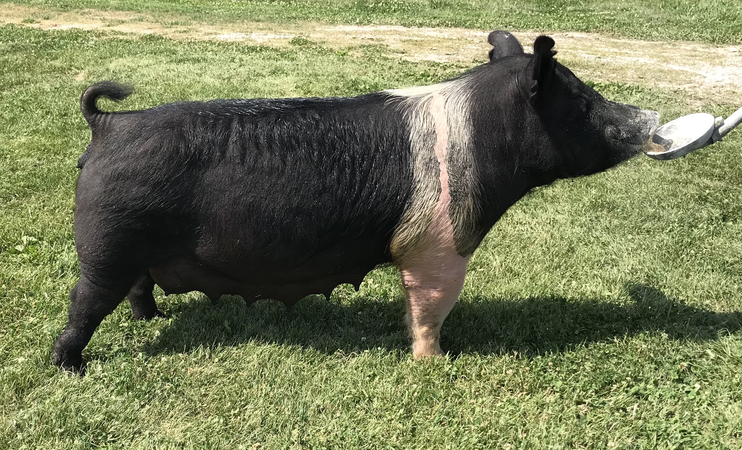 This is the most physically attractive female of our group of Young and Guard sows that we purchased at the time of Delmar's herd dispersal. We have 4 daughters and granddaughters of our 2024 sow herd. Her most influential descendant is sired by Kingpin and has twice-produced our top-grossing litters. She has raised 31 pigs in 3 litters. A pair of her Tru Value daughters are in our top 5 females phenotypically.